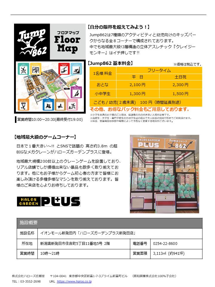2023年7月14日(金)イオンモール新発田2階に「ハローズガーデンプラス」&屋内アスレチックパーク「Jump862」がオープンしました。